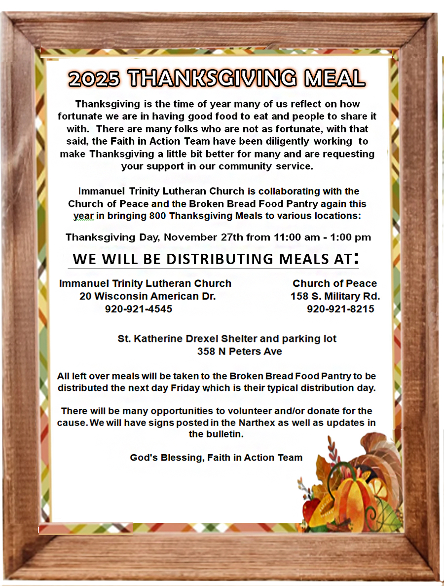 Home Seek New Member Info Forms Baptism/Wedding/ Funeral Contact Us Interior Layout of Immanuel-Trinity Church Serve Gods Work, Our Hands Angel Tree Ministry Mission/Outreach DVD Ministry Loaves and Fishes Faith in Action Thanksgiving Dinner Women of the ELCA Chancel Guild Deborah Circle Dorcas Circle Boy Scouts-Troop 701 Worship Volunteer Sign Up Brown Bag Lunch Program Share SERMON STUDY Prayer Chain Who We Are Meet our Staff Our Church Council 2024 Council Minutes 2025 Council Minutes Christian Education Program - 2025-2026 Media Weekly Bulletin The BEACON Contact I-T ONLINE GIVING Church Calendar Highlights extra Links Baptism Information Form BUILDING USAGE REQUEST Highlights Videos Thanksgiving Dinner